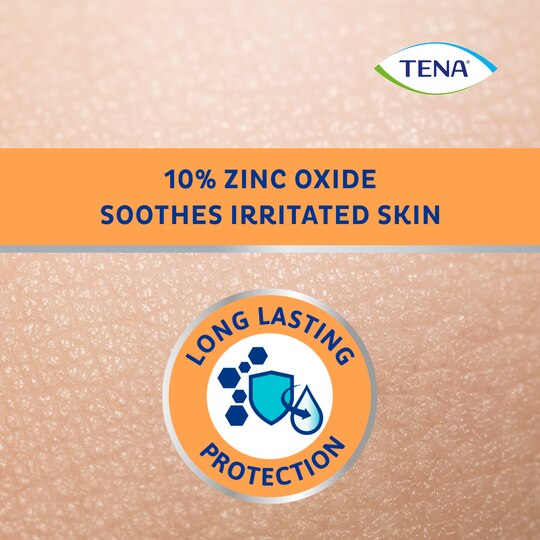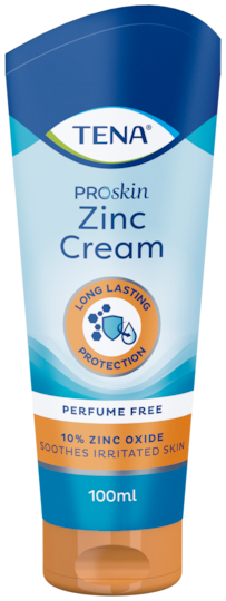 Prodotto per un'elevata protezione e cura con il 10% di ossido di zinco. E' un prodotto cosmetico. TENA ProSkin Zinc Cream è un crema con azione di protezione con il 10% di ossido di zinco, olio di canola e Vitamina E. Questa formula per un'elevata protezione è indicata per le pelli fragili, mature ed irritate. Nel trattamento di irritazioni cutanee nell'adulto, viene applicato regolarmente, in occasione del cambio dell'ausilio assorbente, un sottile strato di TENA ProSkin Zinc Cream nell'area interessata fino a quando l'irritazione non scompare. Oltre ad essere senza profumo e senza conservanti, è dermatologicamente testata per preservare il benessere della pelle.